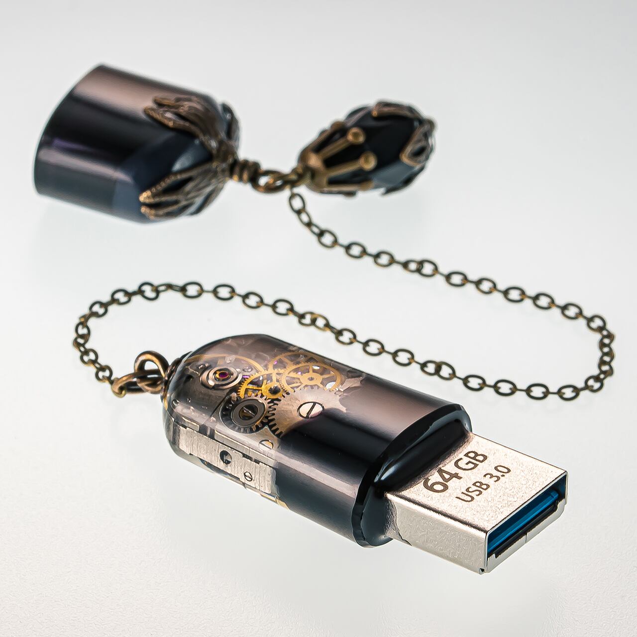 キャップと一体になった外観は、ひと目ではUSBメモリとわからない謎のアンティークガジェットです。1970年前後に製造された手巻きの機械式腕時計ムーブメントを、丸みを帯びたレジンに封入しました。緻密な歯車で構成された複雑な内部を外から眺めることができます。