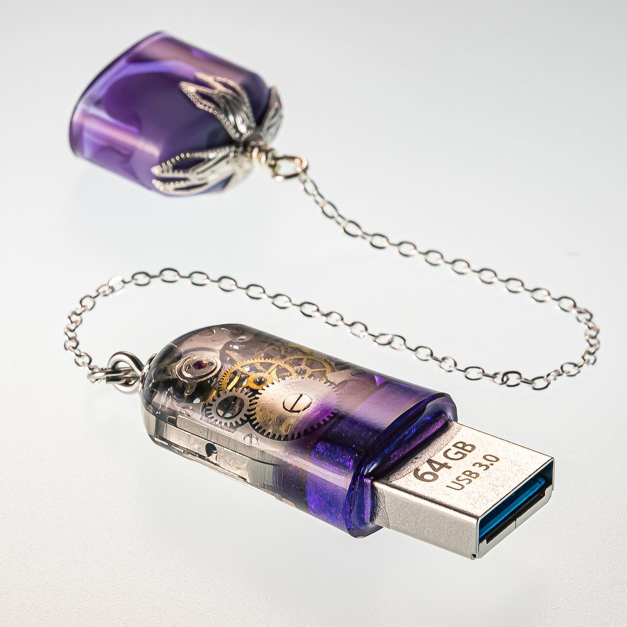 キャップと一体になった外観は、ひと目ではUSBメモリとわからない謎のアンティークガジェットです。1970年前後に製造された手巻きの機械式腕時計ムーブメントを、丸みを帯びたレジンに封入しました。緻密な歯車で構成された複雑な内部を外から眺めることができます。